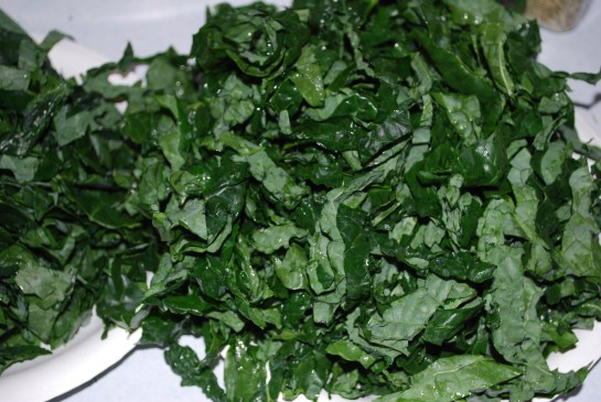 1 large bunch of kale (any variety) – remove thick stems/shred leaves by hand