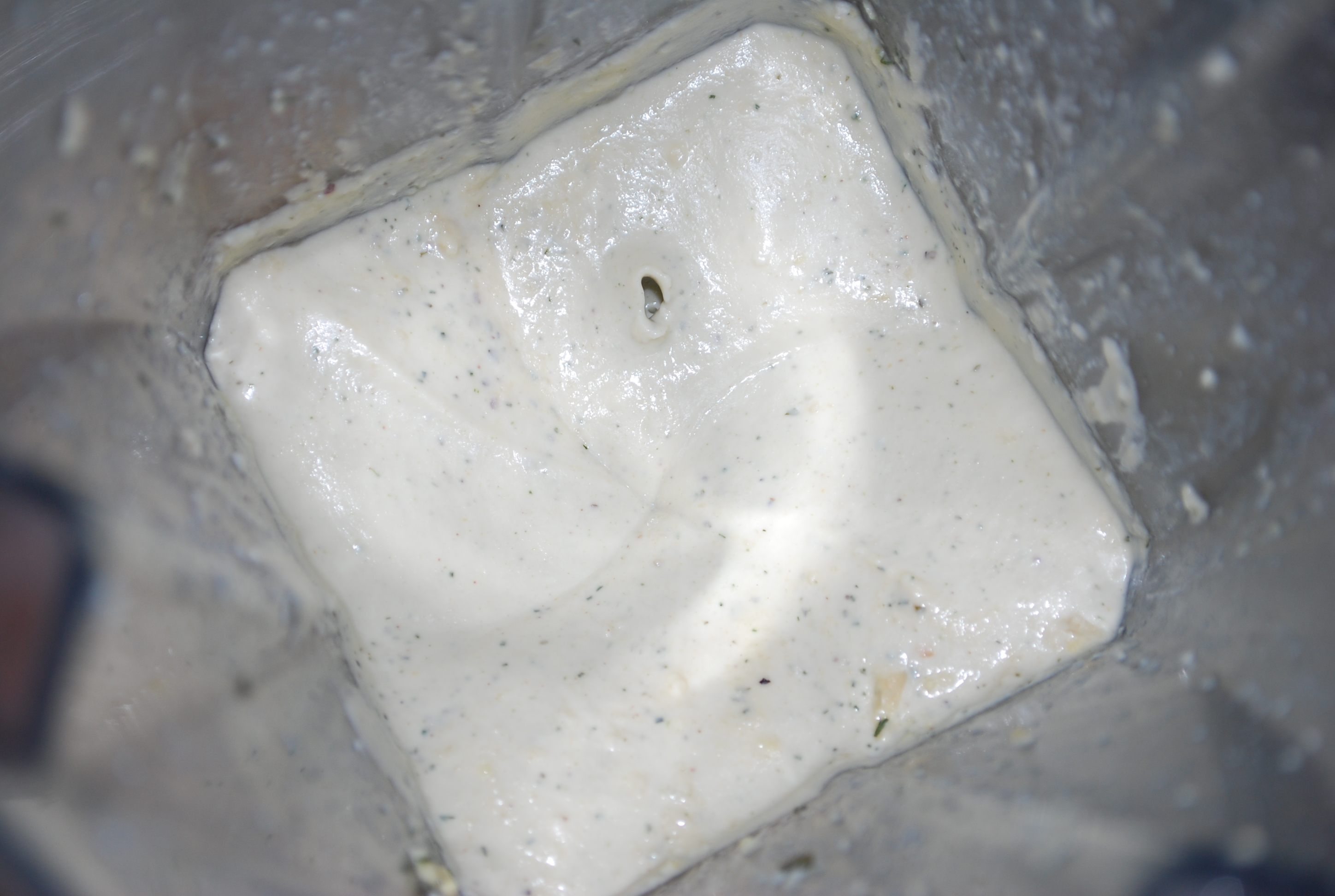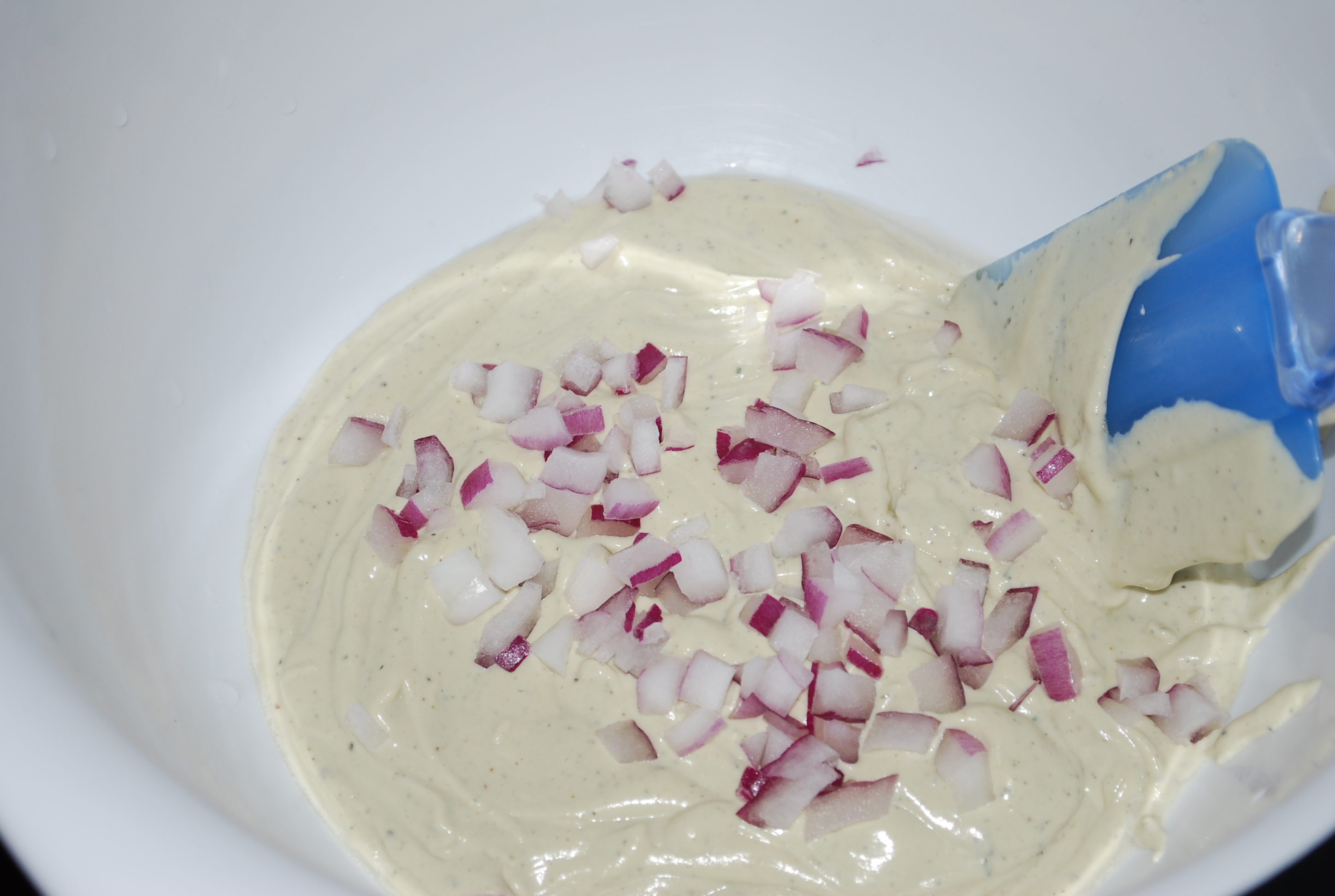 1.) Blend (great in a VitaMix!) the cashews, water and seasonings in a blender until smooth. Place mixture in the bottom of a large mixing bowl and add the chopped onions.