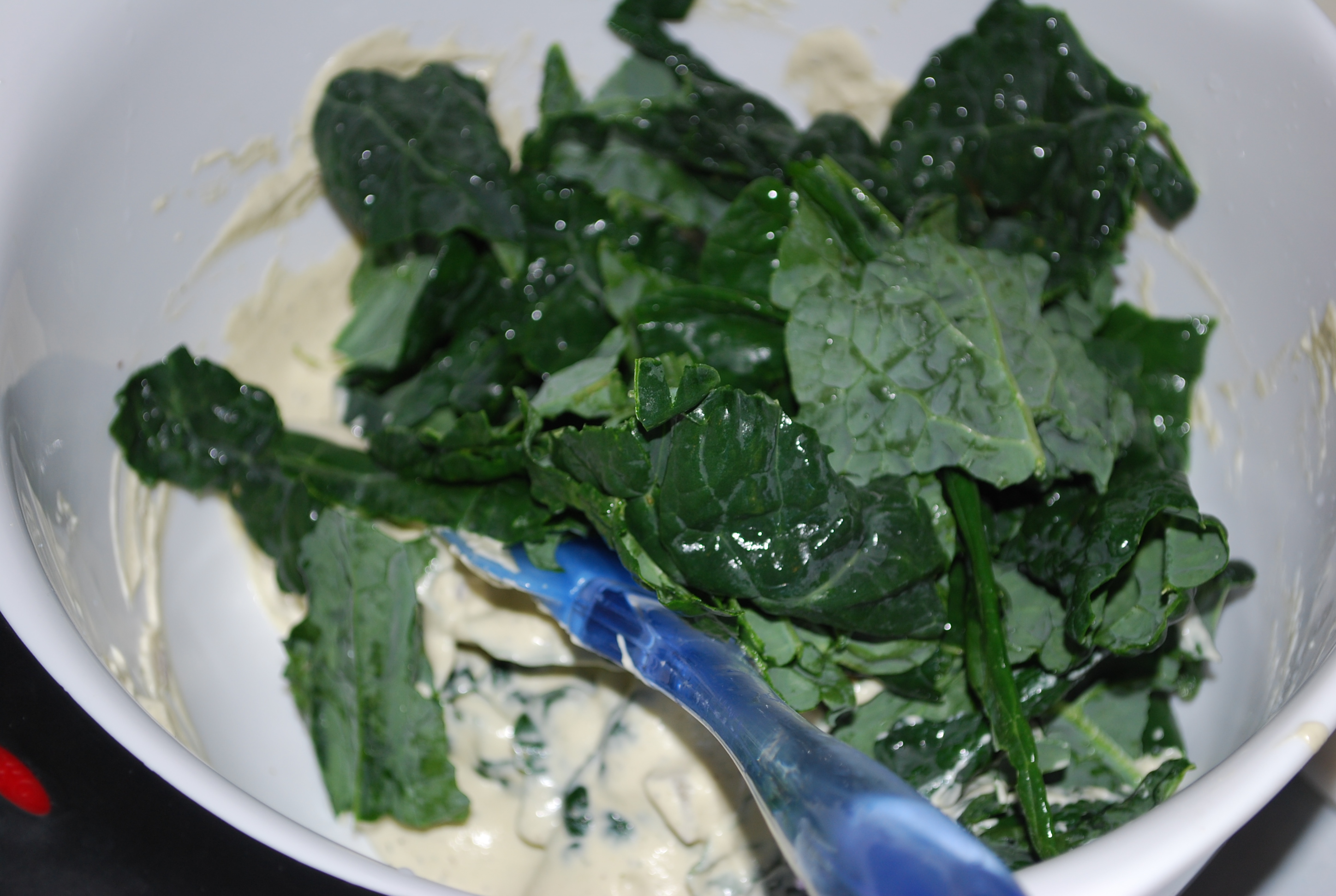 2.) Wash the kale and remove the stems. Tear off chip-sized pieces of the kale and add to the bowl. Using your hands, massage the mixture onto the kale bites so that each piece is well coated.