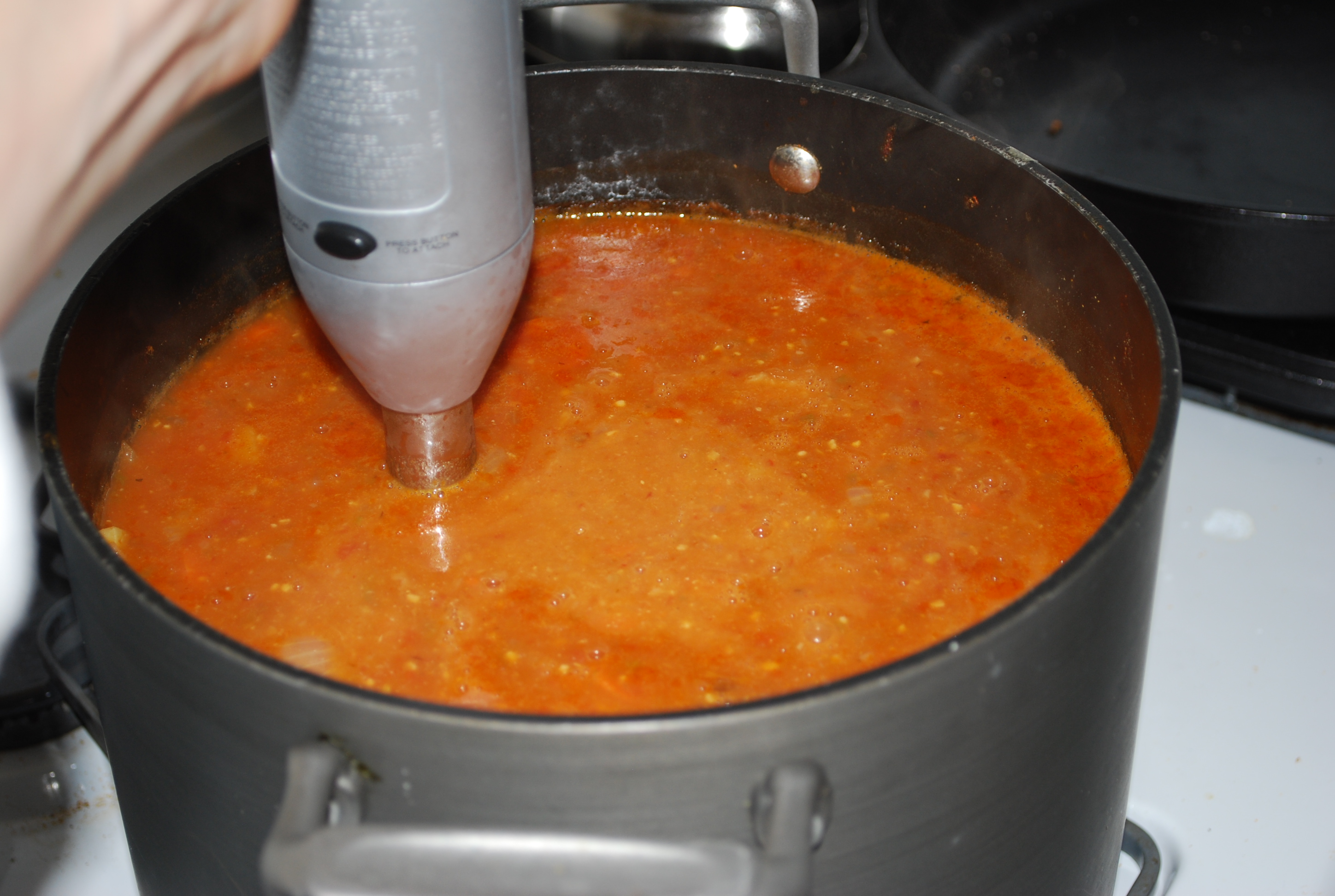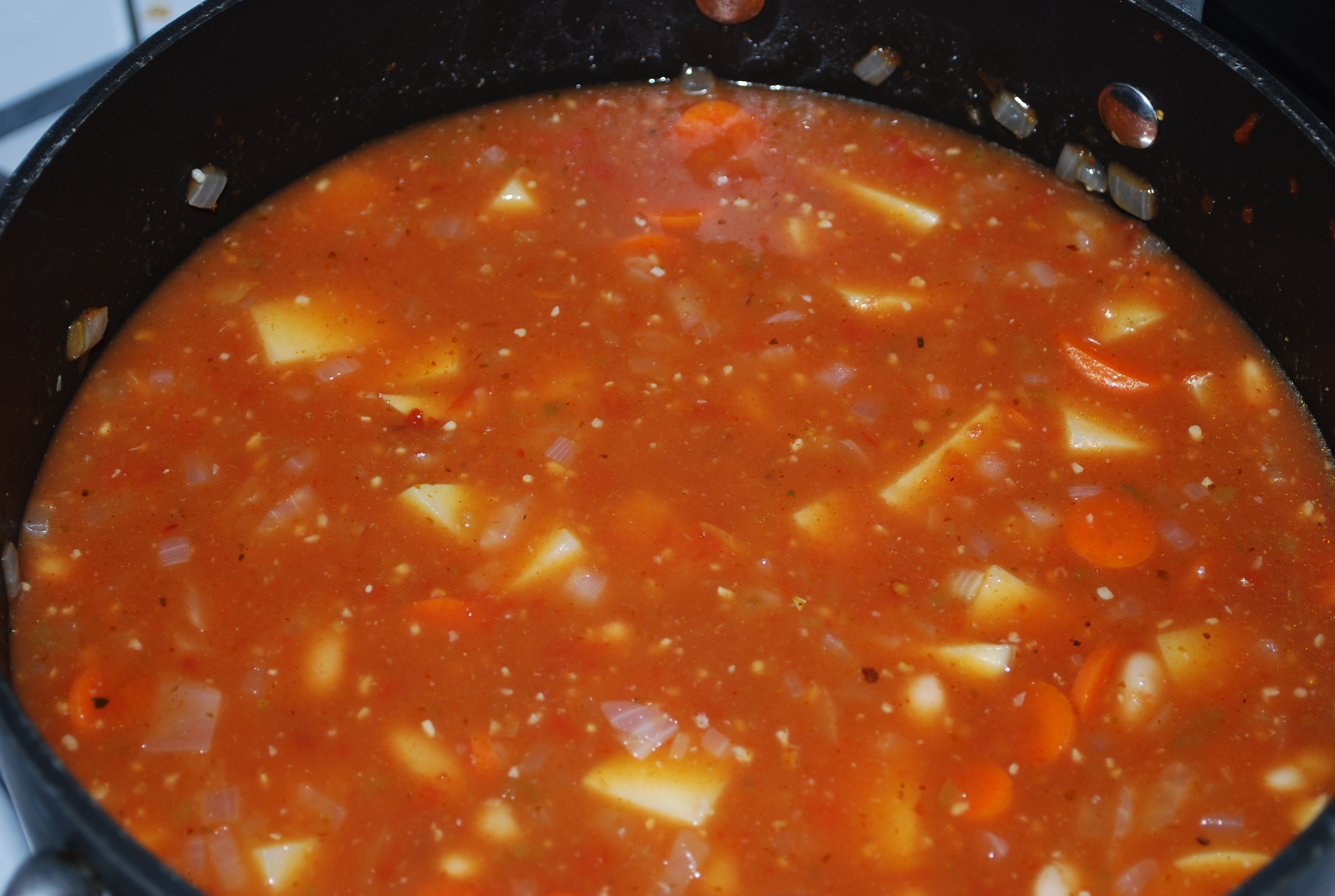 2. Add the beans, potatoes, salsa and tomatoes along with the broth. Cover and bring to a strong simmer for 10 minutes.