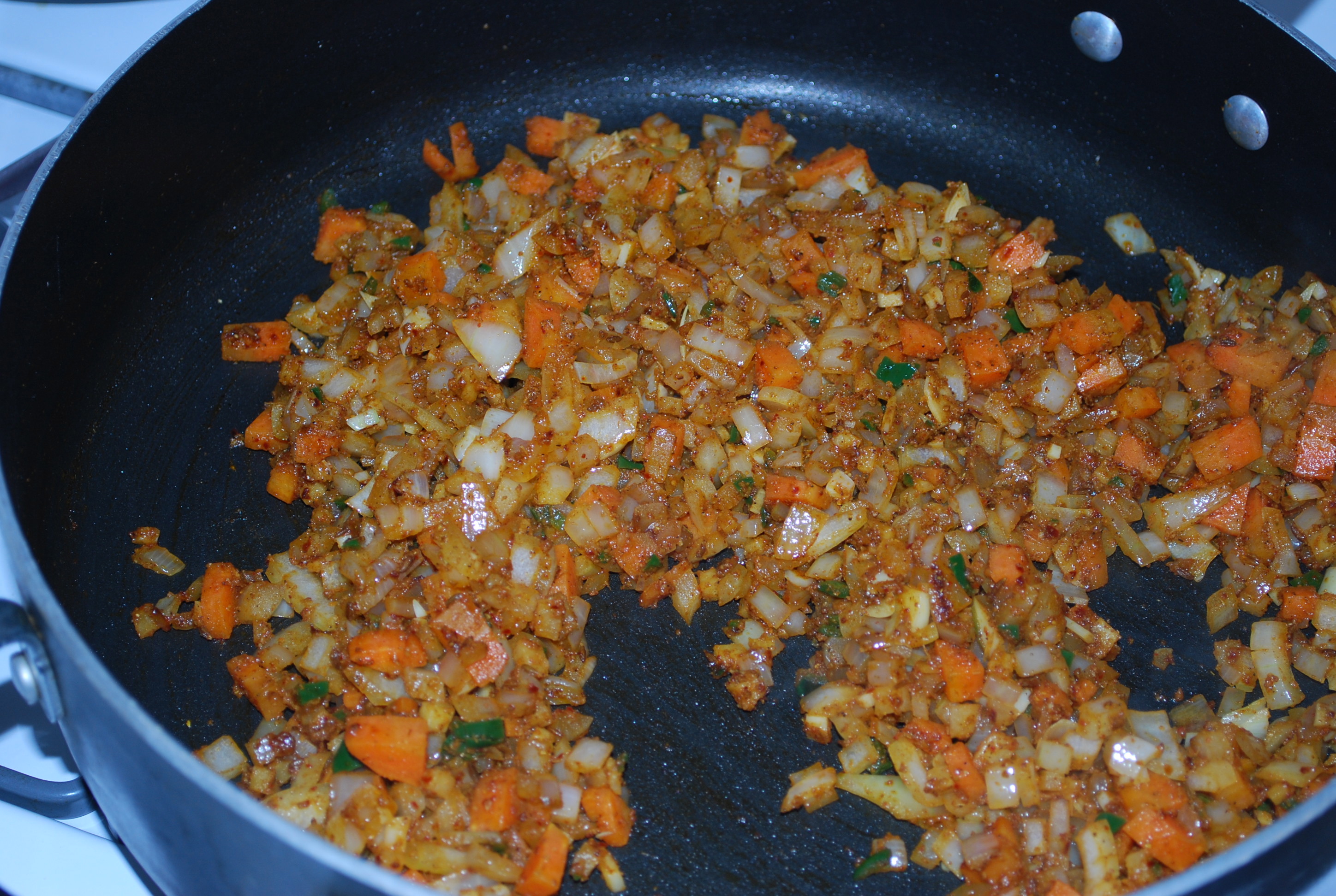 - Saute the spices, onion, garlic, ginger, veggies and creole seasoning for several minutes.
