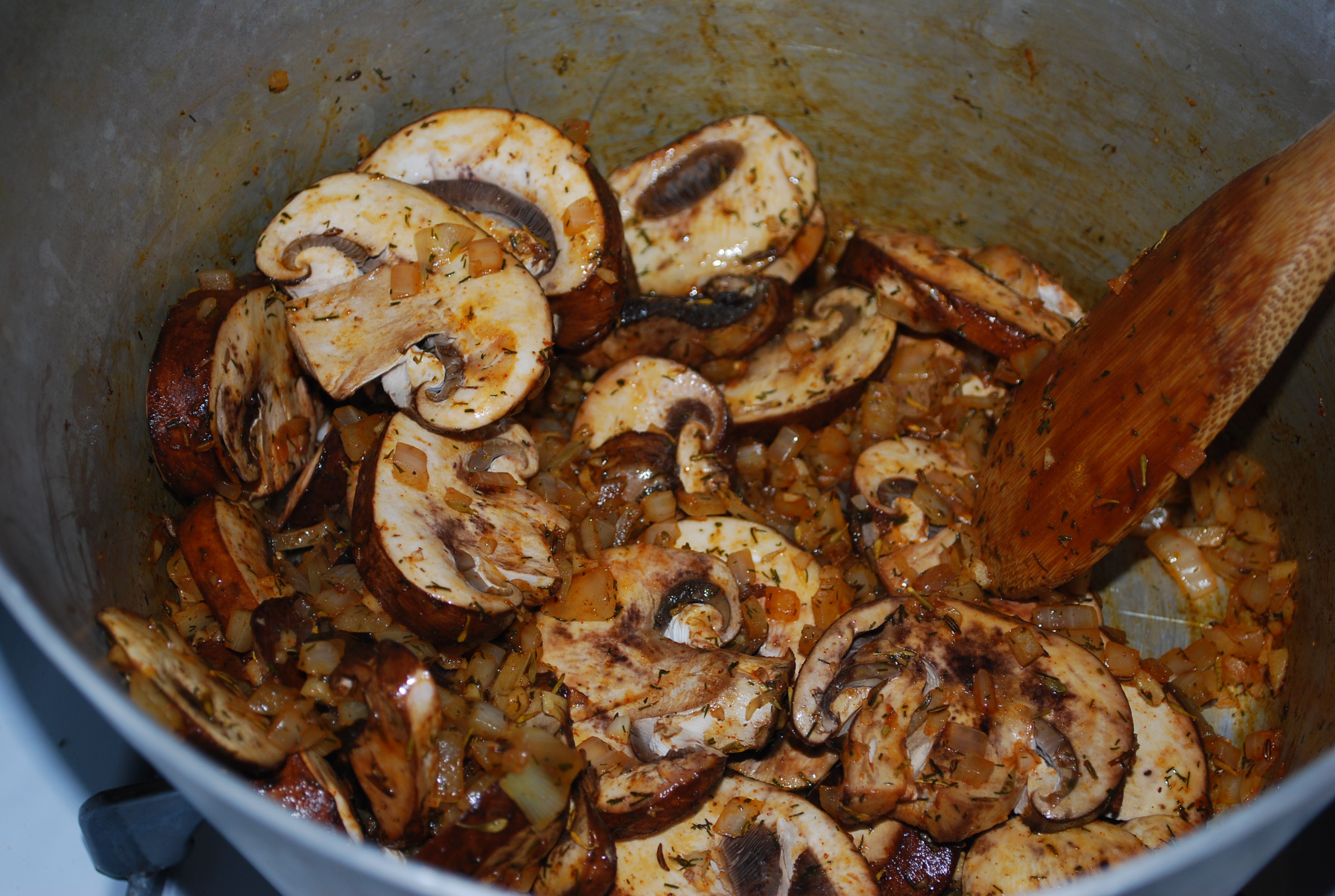 Saute onion, garlic and spices. Add in cabbage, potato, mushrooms and chipotle