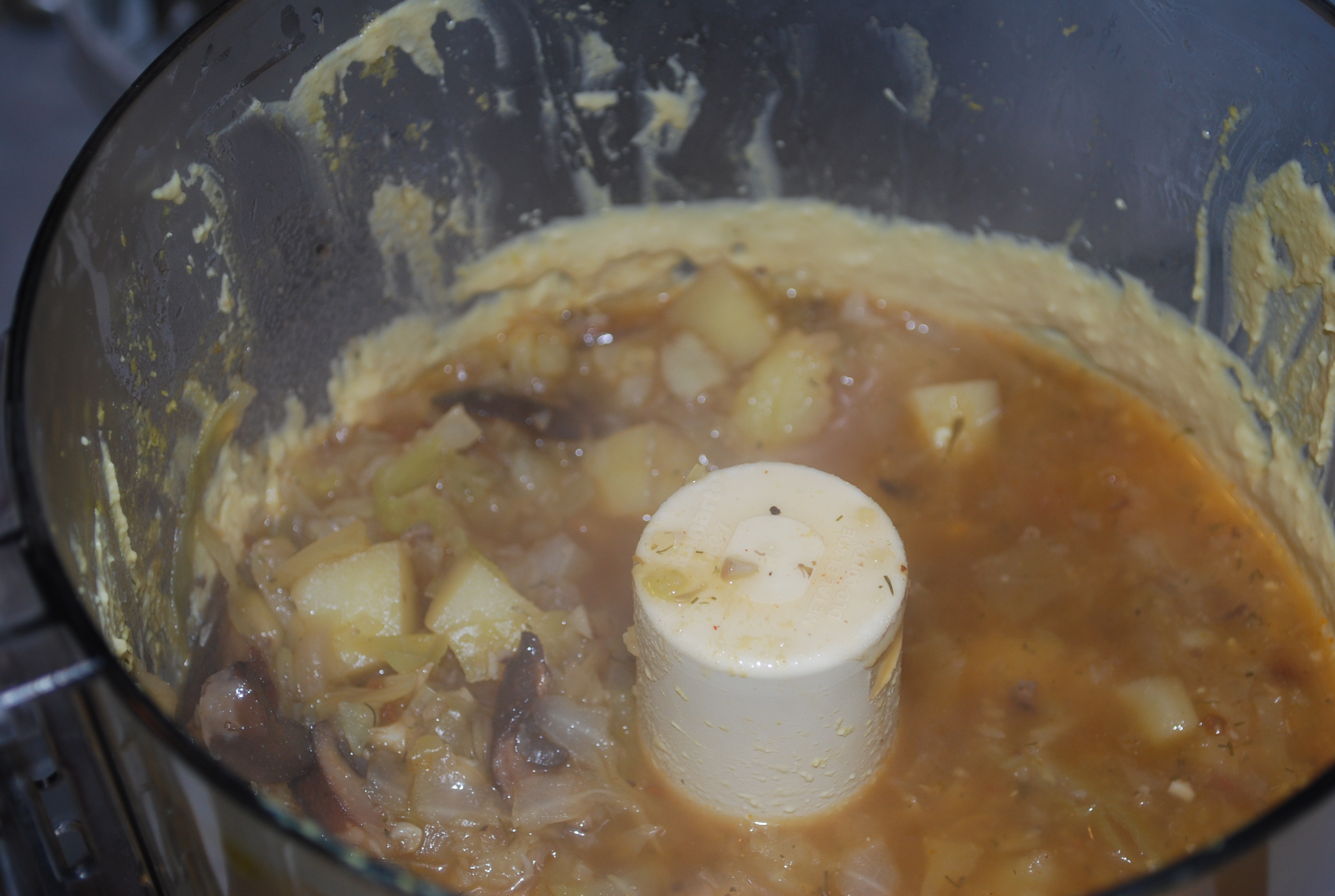 4. If you’d like, add around 3 cups of the soup to the food processor and puree for a creamier soup (and to get all of the cheesy sauce out!). Add the pureed soup back into the pot – THIS IS WHAT I DID