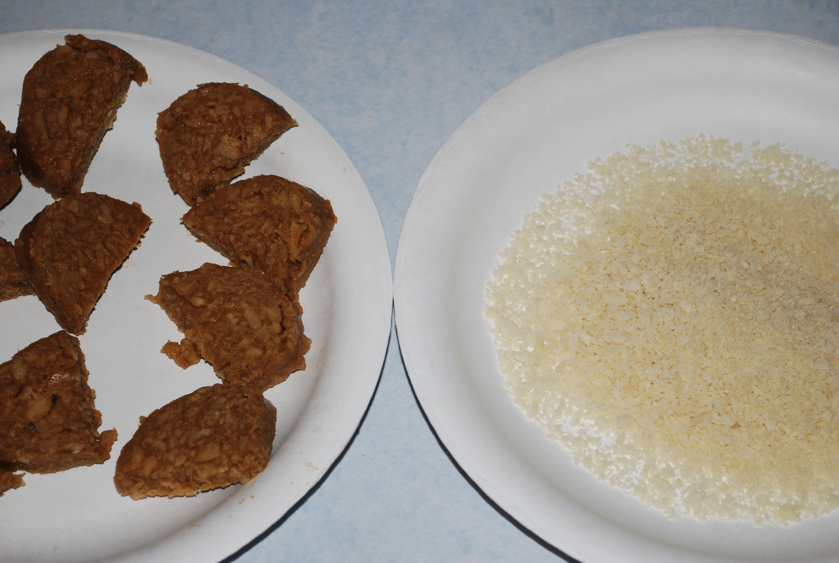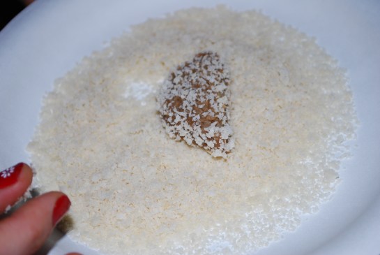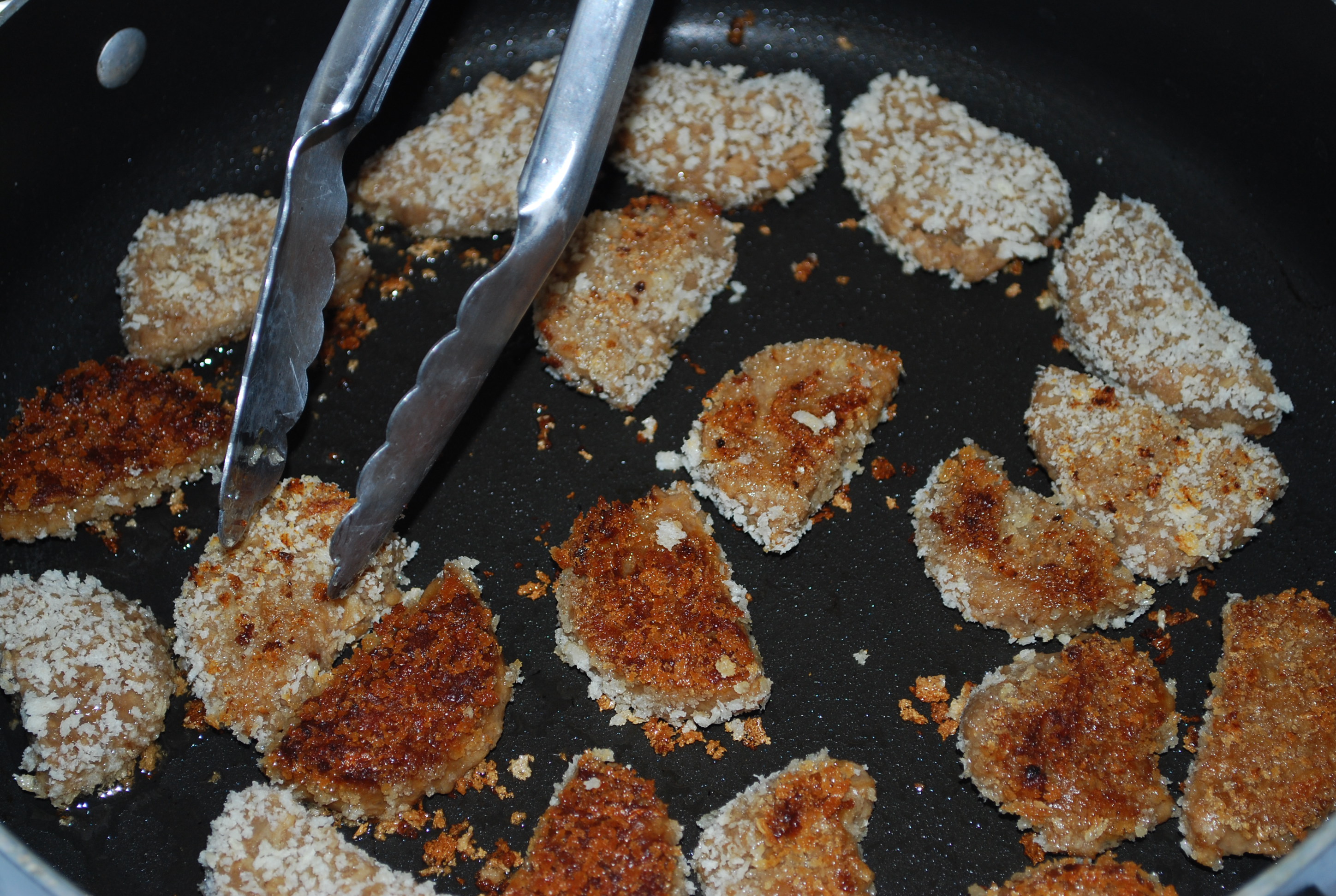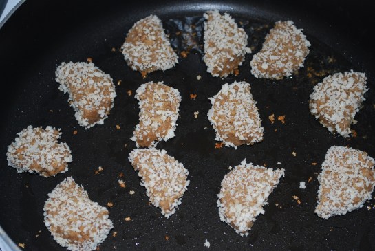 3. When the oil is hot, quickly roll each sausage nugget in the Panko and place in the sizzling hot oil. Continue doing this until the pan is filled. Allow each nugget to sauté for about 2 minutes on each side. You want the Panko crumb to crisp and brown and saturate with the oil so that they are no longer a white color — but now a caramel brown.