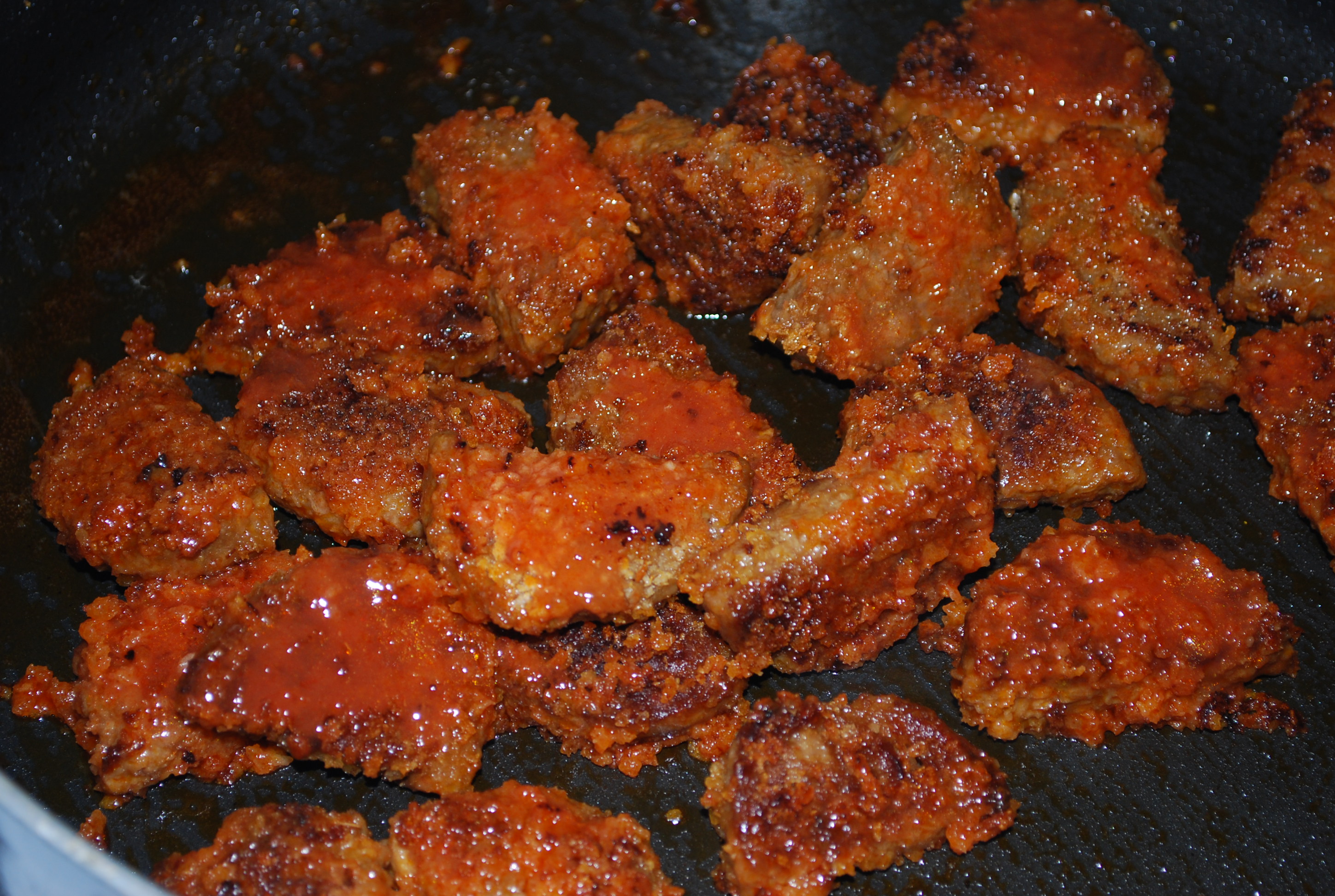 4. When your nuggets are evenly cooked, and the oil mostly absorbed/cooked off. Turn the heat off and add in your hot sauce in a casual ‘splashy’ way. You want a nice splash of sauce to accent ( but not overly saturate) each of the bites. Toss the nuggets in the still hot pan with the sauce as they sizzle and cook.