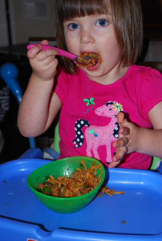 I was craving taco soup when I found this recipe with quinoa added… score! Why didn’t I think of that?!? Leave it to Nava Atlas to think of something like that, she has awesome recipes! This recipe is from her site VegKitchen.com. My toddler ate two bowls of this!