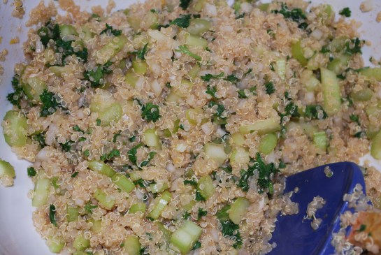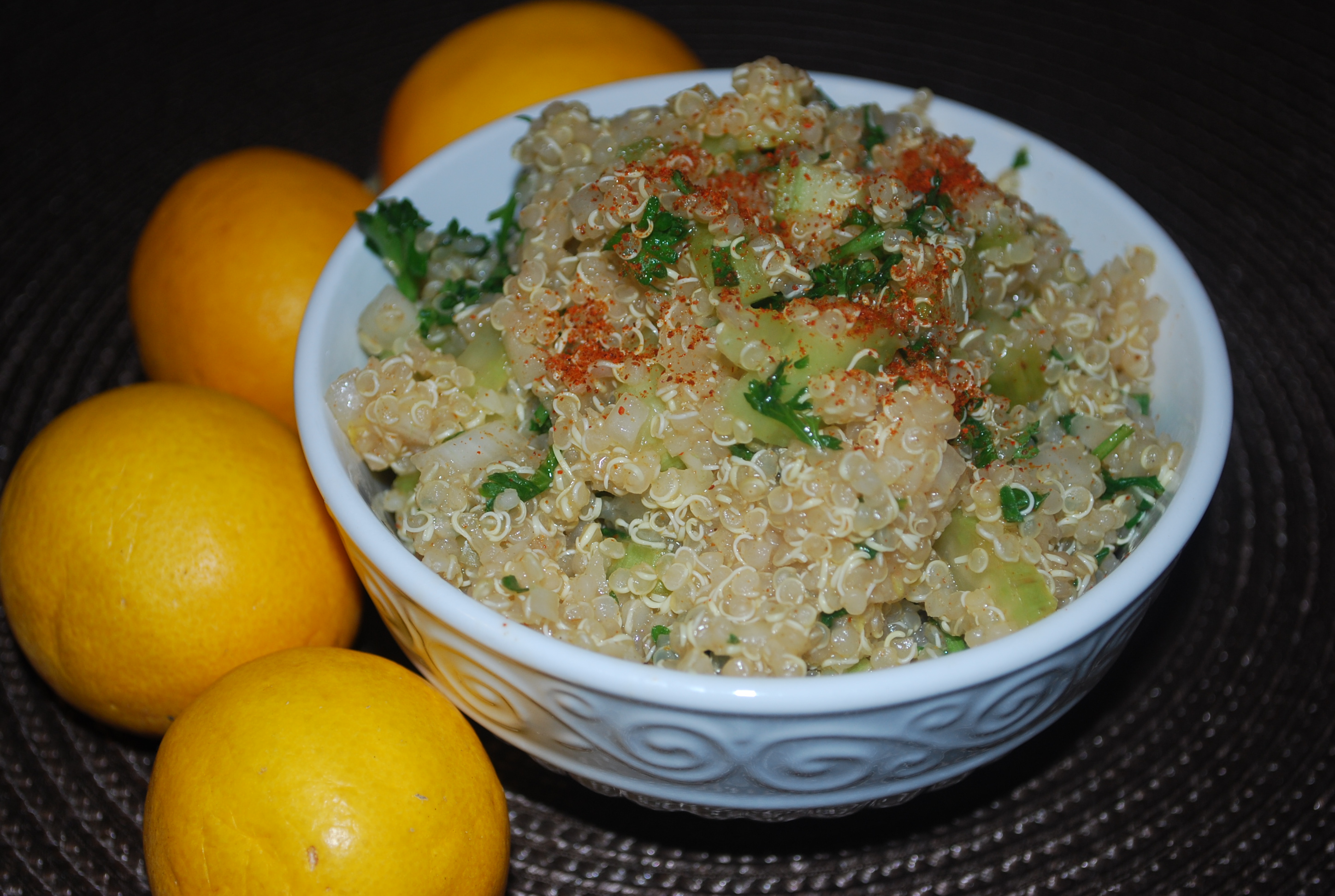 I make quinoa every few days and add it to all sorts of things, I like to always keep a cooked bean and grain on hand at all times. Here’s a really easy way to spruce up your regular quinoa. 🙂 I usually double this recipe because we like leftovers. I use this in collard wraps with Chickpea Salad or with Gingered Tofu & Zucchini. Our toddler loves this!