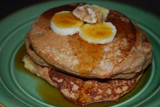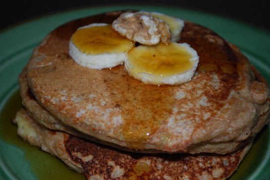 These are really good and easy to make, plus this batch makes a bunch of leftovers – great when you’ve been up all night with your 4-month old and you need a quick breakfast for your toddler! That’s my story lately so I really appreciate these kind of easy recipes. My toddler loves these pancakes! I top them with peanut butter and bananas for her… pure maple syrup for me. I put the leftovers in the fridge and toast them the next day.
