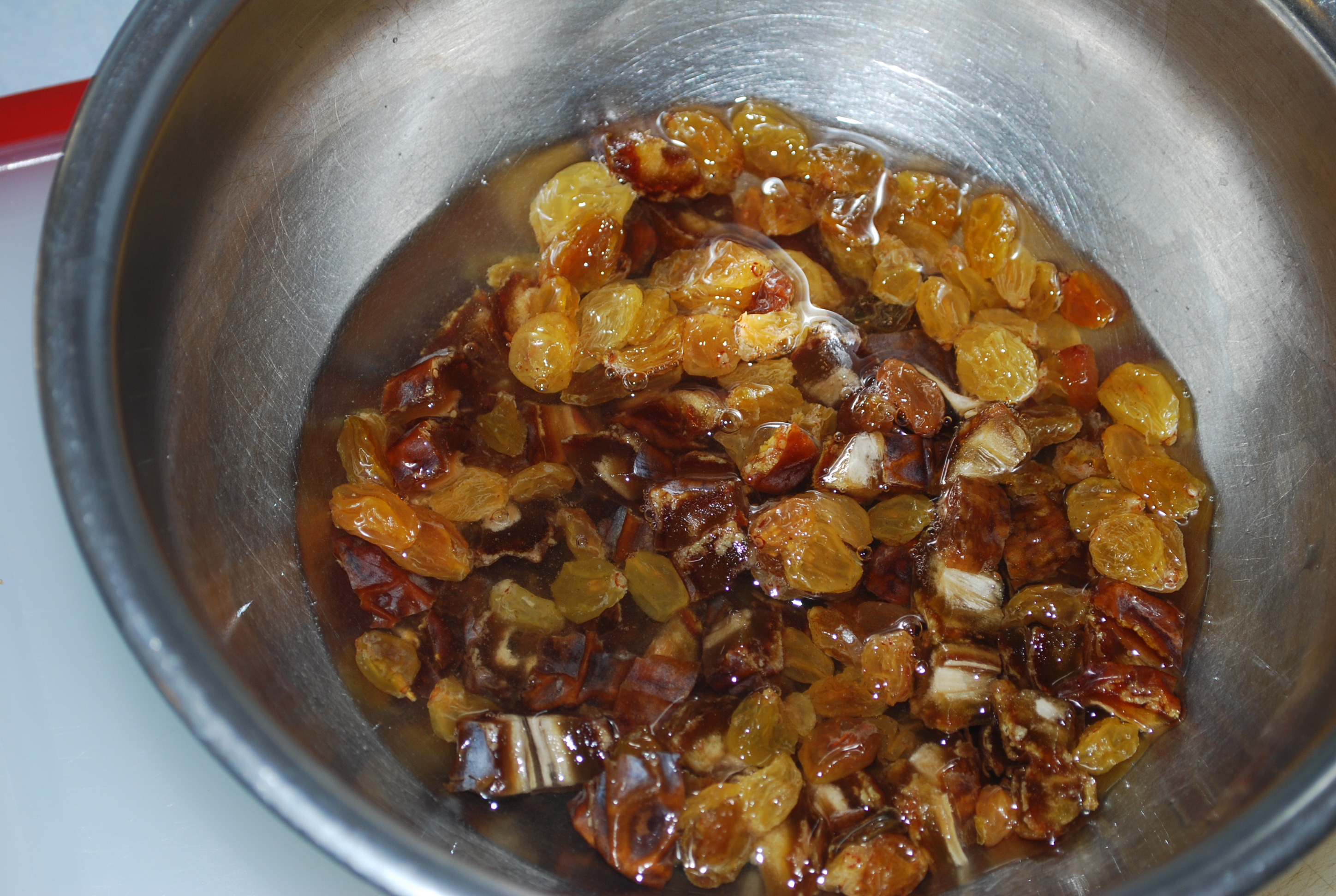 1. Preheat oven to 350 degrees with rack in center position. In a small bowl, combine the 5 dates, 1/4 cup raisins and 1/2 cup water. Let soak while you prepare the other ingredients (at least 15 minutes).