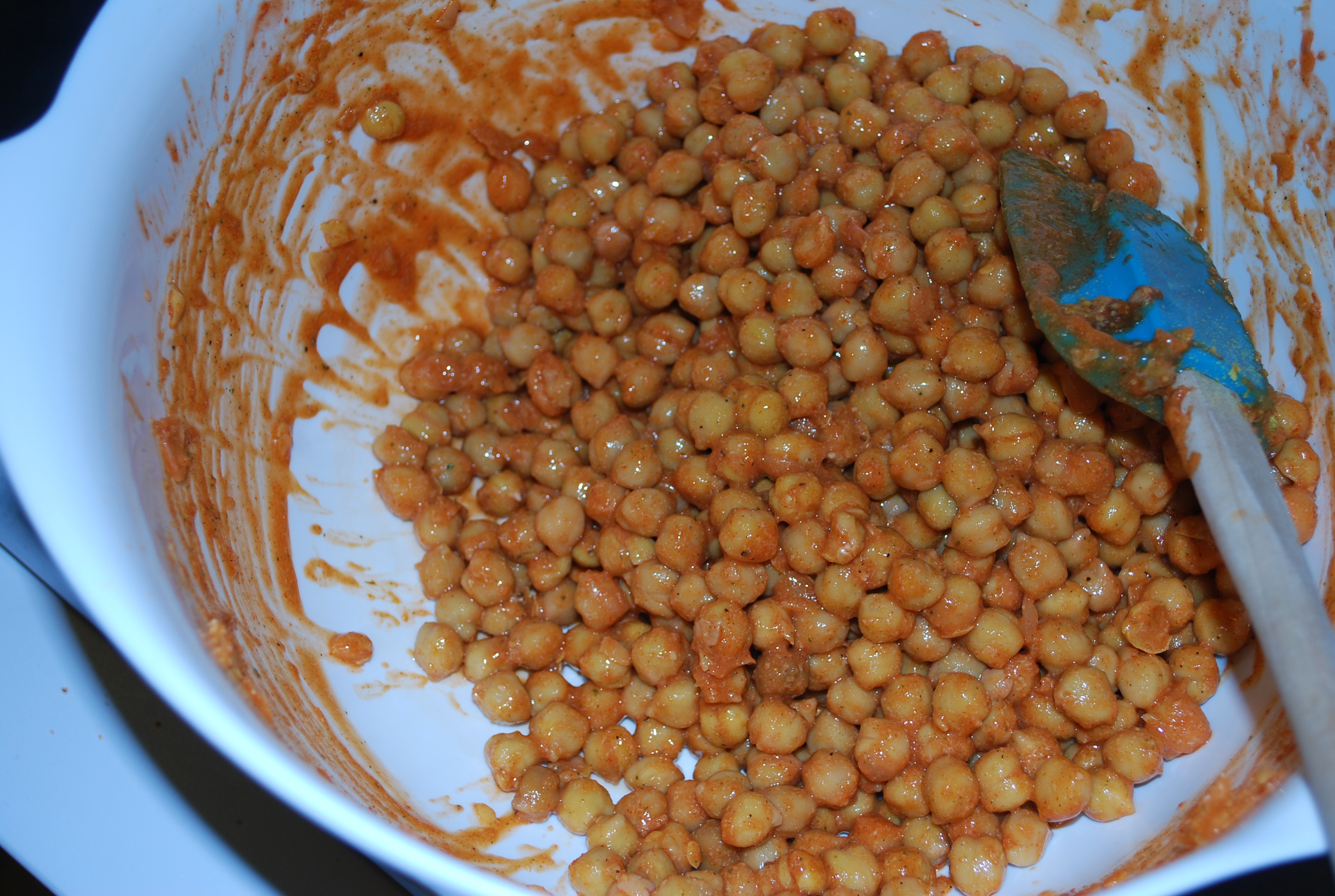 Strain off marinade and set aside. Preheat oven to 400, spread chickpeas on parchment lined baking sheet.