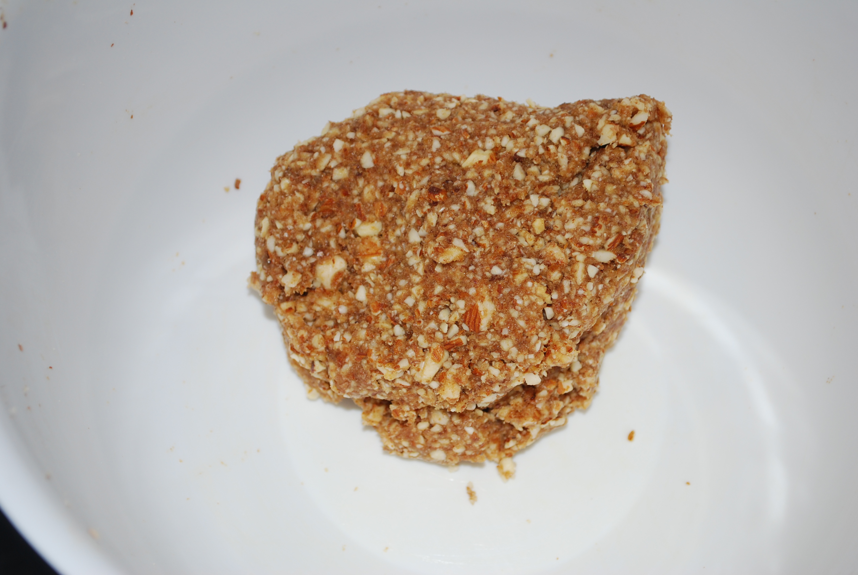Add the nuts to the processor and pulse until chopped fairly small (but not too much, not nut flour. You want texture). Add the nuts, along with the sea salt, to the bowl with the fruit/date paste. Use your fingers to knead the nuts into the paste.