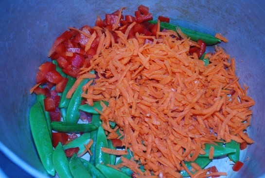 * Sautéed 1 diced red pepper, 1 cup shredded carrots and 1 cup snow peas in a tiny bit of peanut oil