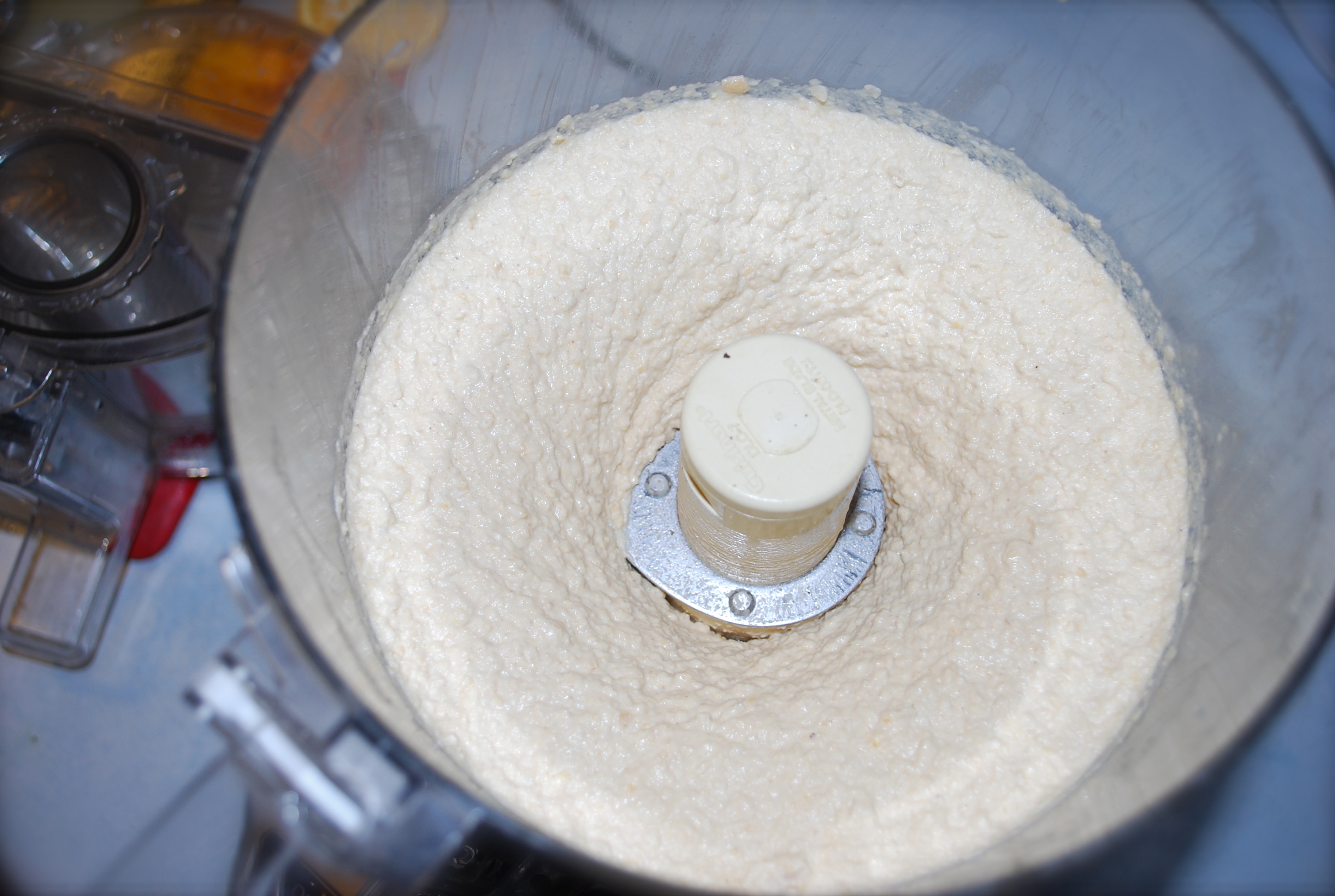 Process cashews into a flour using your food processor, slowly add water until it reaches a creamy consistency. (This was before I added more water to make it smooth)