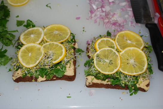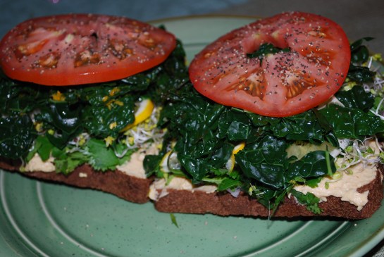 Ever since we watched the movie Planeat, I’ve been on a quest for a good oil-free hummus! I’ve been making these Kale Sandwiches from that movie about every other day, they’re so good! (Terrible picture, sorry! I was too busy eating the hummus to take a good pic!)