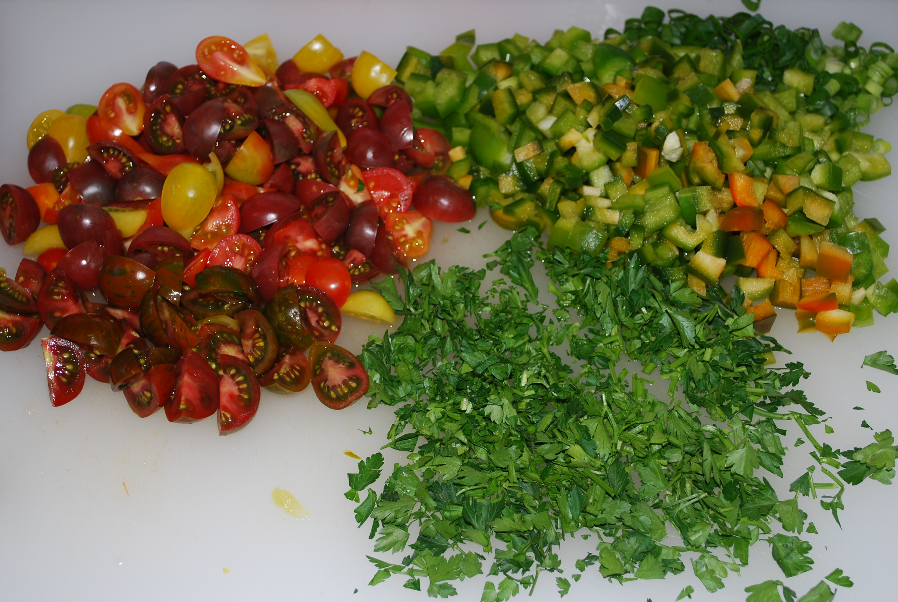 2. In a large bowl, whisk together lemon juice and zest, vinegar, shallot, Dijon mustard, honey/agave, garlic, thyme, cumin, salt and pepper. Add chopped tomatoes, parsley, green onion, dried cranberries, sprouts and bell pepper.
