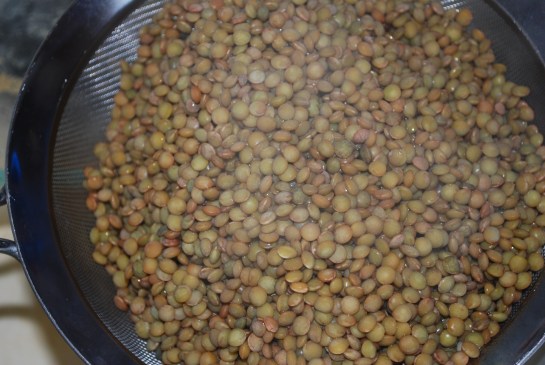 1   Wash the lentils in cold water until the water runs clear (this is very important or the lentils will get “scummy”), put the lentils in a medium sized pot with water to cover and simmer until lentils tender. This should take 10-15 minutes.