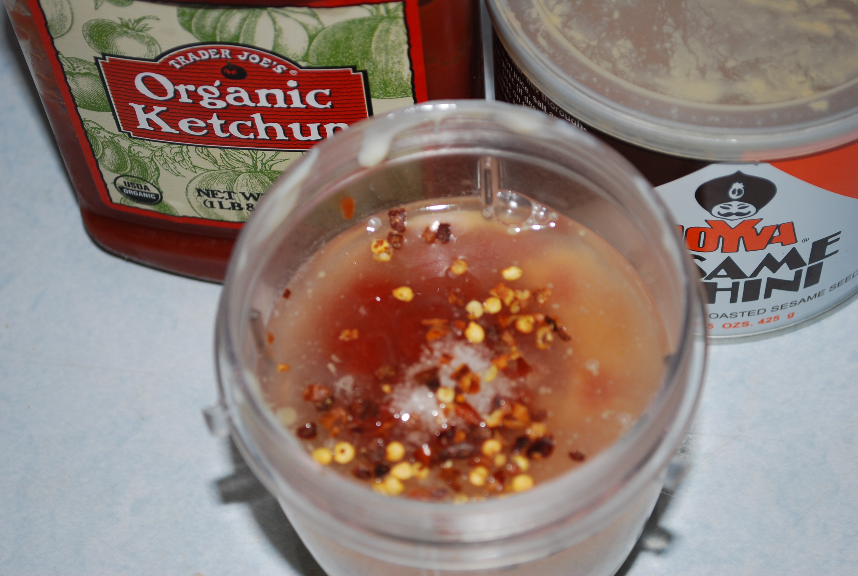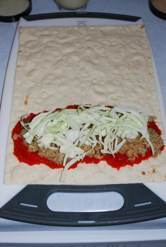 I wasn’t super crazy about the tahini sauce recipe that came with the wrap recipe from theKitchn so I did a little hunting… maybe it was the lack of salt? Hmmm…. I found a Yogurt Tahini Sauce on one of my absolute favorite vegan food blogs Fat Free Vegan Kitchen and made that as well. Now THAT is a good tahini sauce! Her secret ingredient is ketchup, who would’ve guessed to use that! Genius!!!