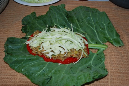 I served these in collard wraps instead of buns but you can do as you like. I topped the burger with Cashew Basil Cheese, leftover from Portobello Mushroom Pizzas. Yummy!!!