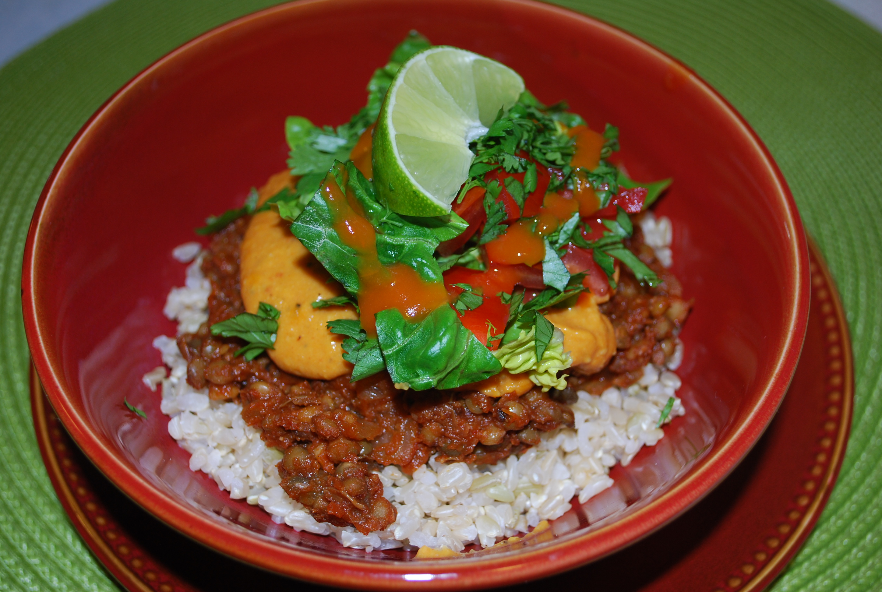 Ancho Lentil Bowl with Low-Fat Vegan Cheese
