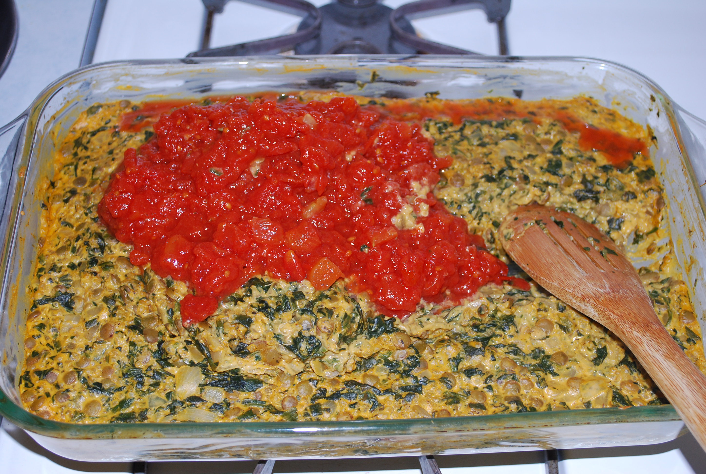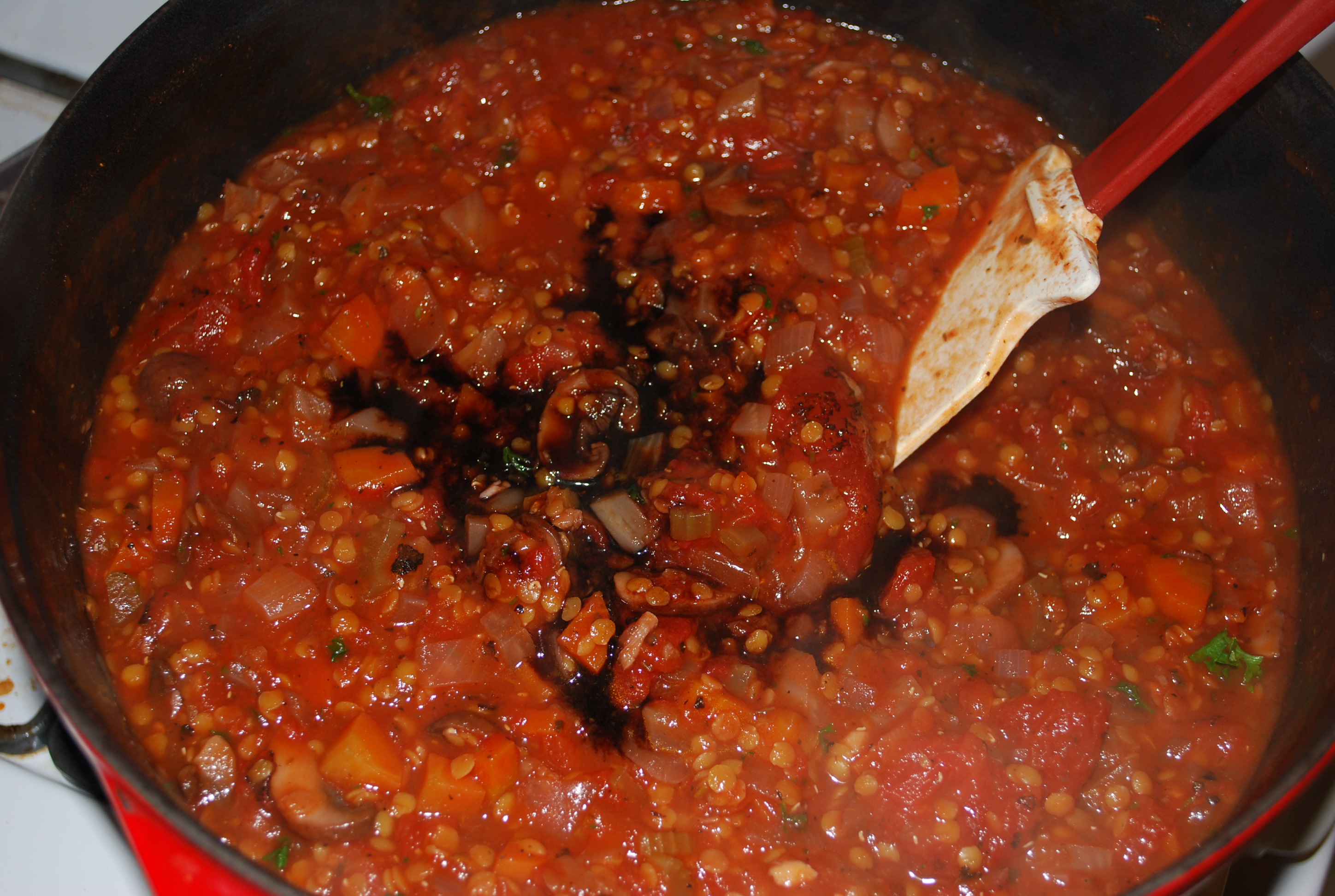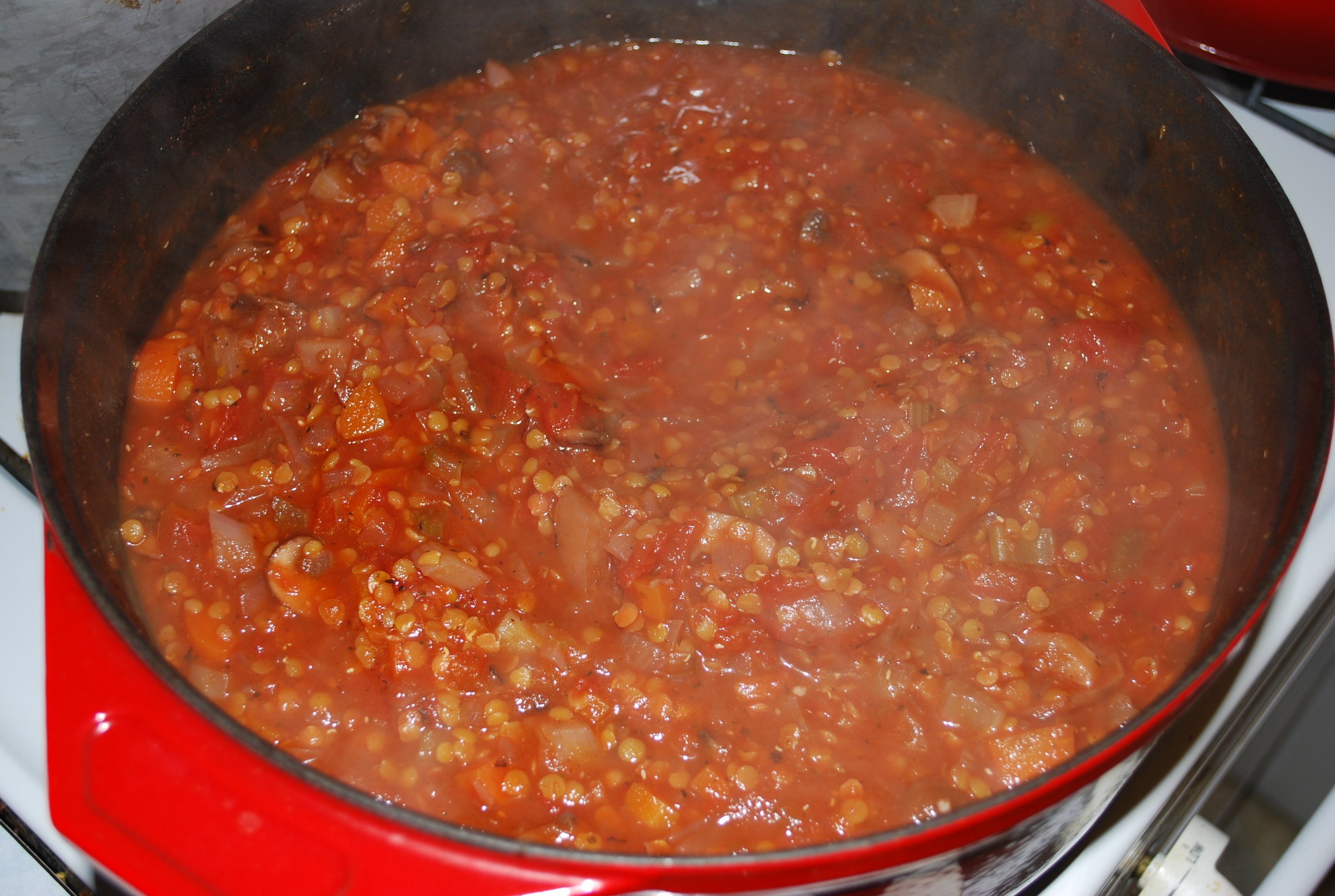 Add in tomatoes, tomato paste, red wine and broth and let cook for 30-60 minutes. Add lentils and cook about 30 more minutes.