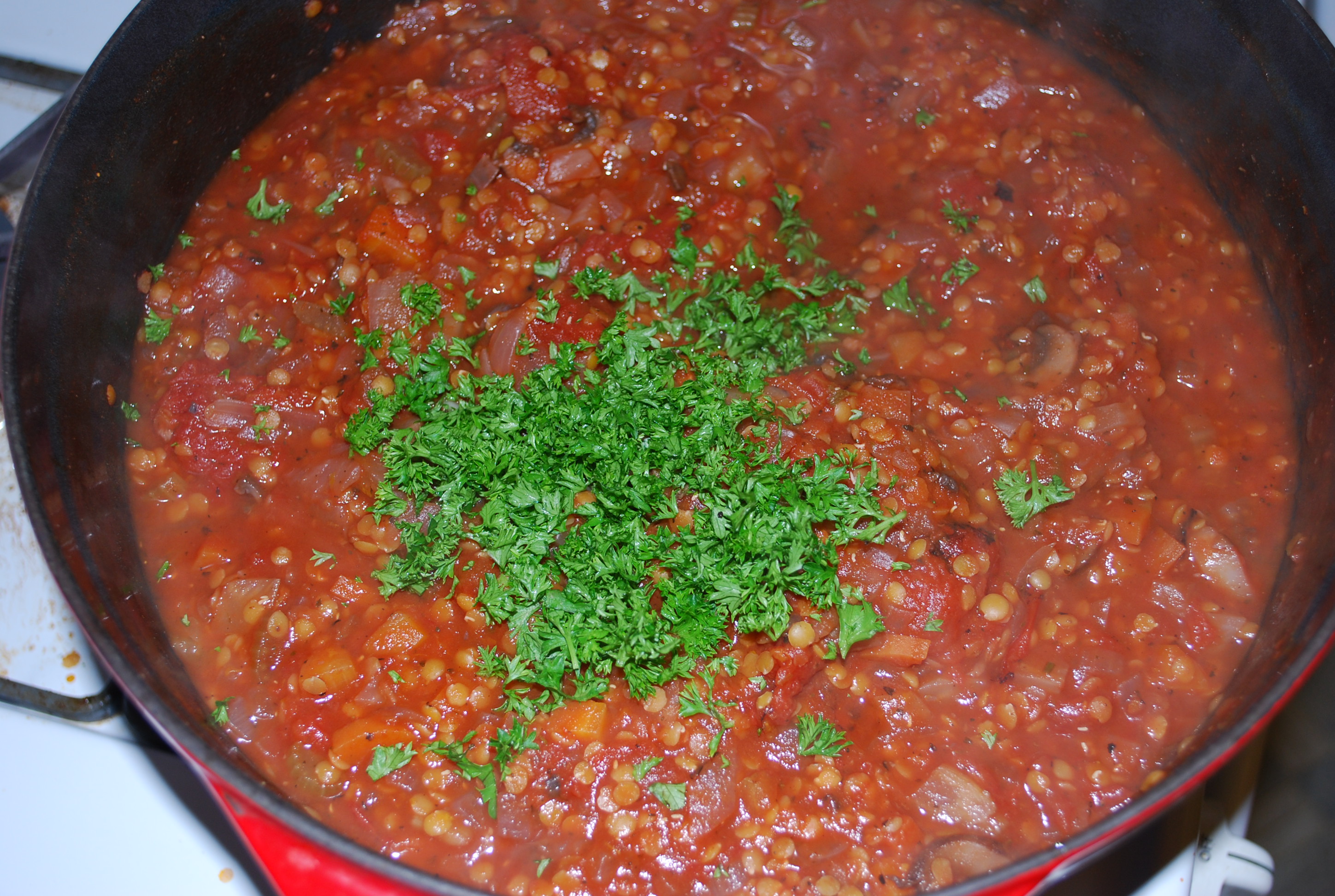 4. Add lentils, cover and cook until lentils are done – about 30 minutes or so. Stir in parsley and balsamic vinegar, let cook a few more minutes. Add salt and pepper to taste and serve.